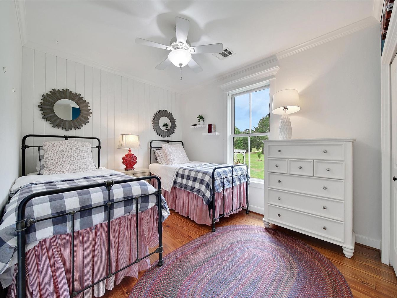 This cozy guest bedroom features two twin iron-frame beds dressed in a classic black and white buffalo check pattern with pink gingham bed skirts, adding a charming layered texture. The walls are painted bright white with vertical paneling behind the beds, creating a fresh, clean backdrop. Two decorative sunburst mirrors hang above each bed, providing symmetry and a touch of rustic elegance. A white chest of drawers stands by the large window, topped with a modern white lamp, while the warm wood floor is partially covered by a colorful braided oval rug, enhancing the inviting farmhouse aesthetic. Natural light floods through the window, highlighting the serene outdoor view and softening the space.