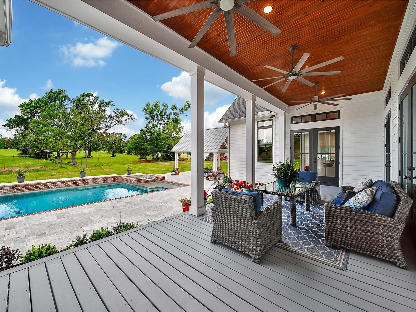 This inviting covered patio features a warm wooden ceiling with recessed lighting and two modern ceiling fans, enhancing comfort and style. The flooring is a light gray wood plank, complementing the white exterior walls and black-trimmed windows and doors. The seating area includes a woven rattan-style sofa and chairs with deep blue cushions, arranged around a glass-top coffee table on a patterned blue and white rug. The patio overlooks a bordered rectangular pool, surrounded by light stone tiles with potted plants adding subtle greenery. Expansive lawn and mature trees create a serene, open countryside vista.