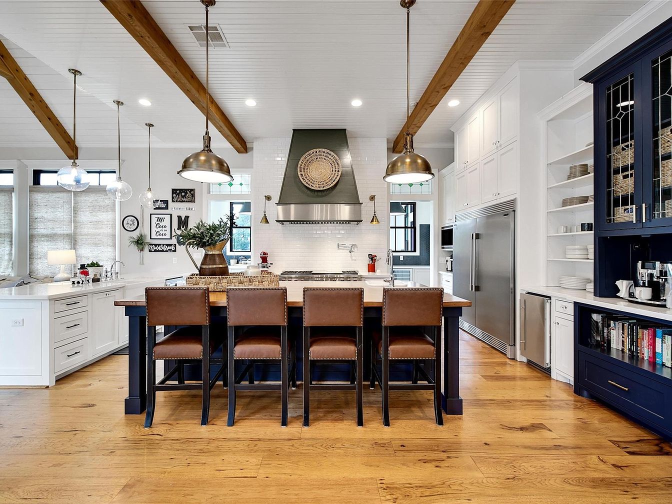 This spacious kitchen features a large central island with a wooden countertop and five brown leather bar stools with nailhead trim, creating a welcoming spot for casual dining or gatherings. The ceiling showcases exposed wood beams contrasting against a white shiplap finish, enhancing the airy, farmhouse-inspired aesthetic. The kitchen hood above the stove is dark green with a decorative round wicker piece adding a rustic charm. Pendant lights with brass finishes hang above the island, coordinating with wall-mounted sconces. White cabinetry surrounds stainless steel appliances, while a navy-blue built-in storage unit with glass-front cabinets and open shelving offers both functionality and style. Warm, natural wood flooring unifies the space with an inviting and cohesive look.