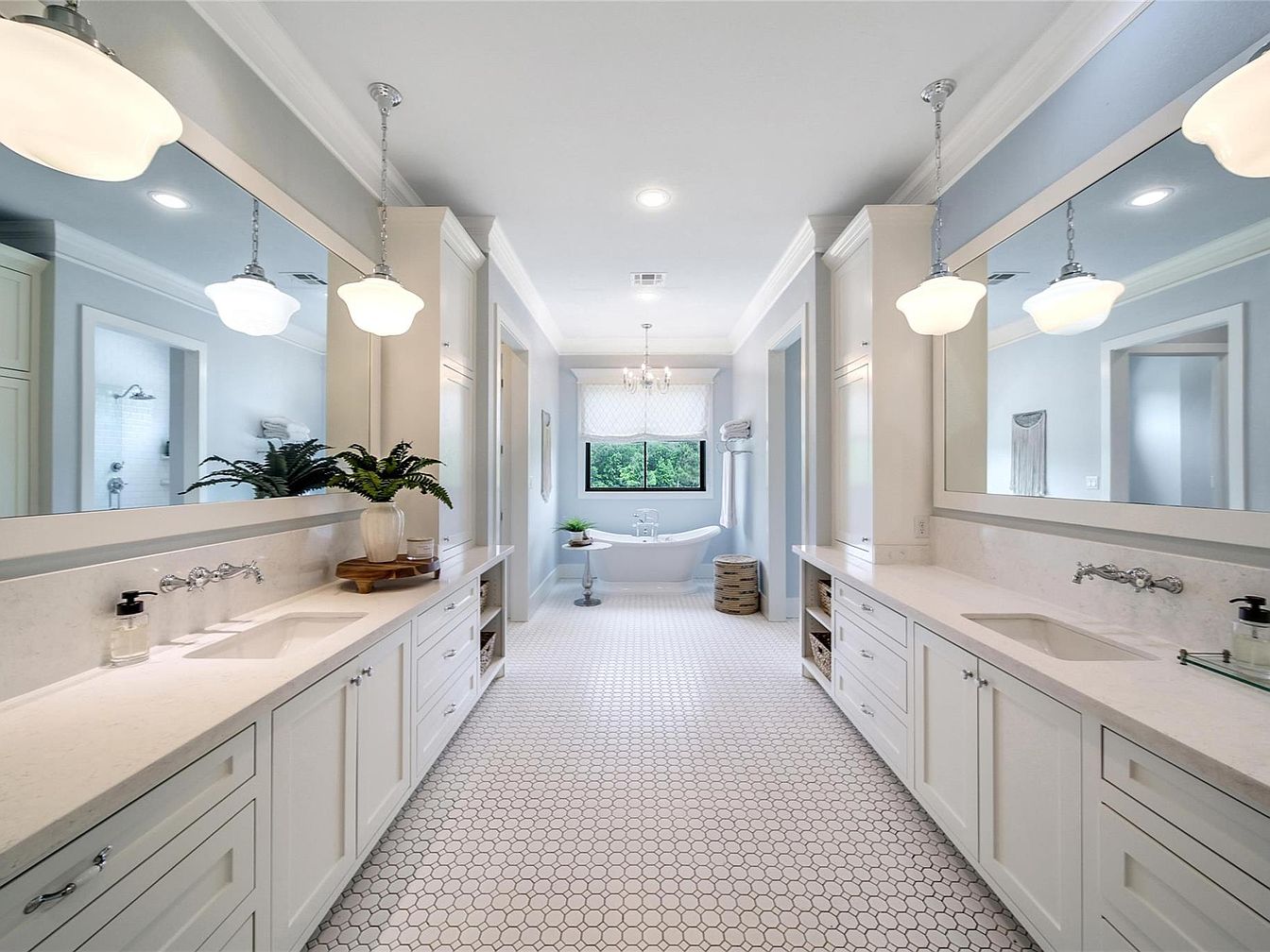 This master bathroom features a spacious dual vanity setup with white cabinetry and sleek marble countertops. Large rectangular mirrors span the length above each sink, reflecting ample light from elegant pendant lamps hanging overhead. The hexagonal white tile flooring adds subtle texture, enhancing the clean and bright aesthetic. Towards the far end, a freestanding tub sits near a wide window dressed with a soft patterned roller shade, inviting natural light and providing a serene view. The design embraces a classic yet modern style with muted tones, chrome fixtures, and thoughtful symmetry for an inviting, luxurious atmosphere.
