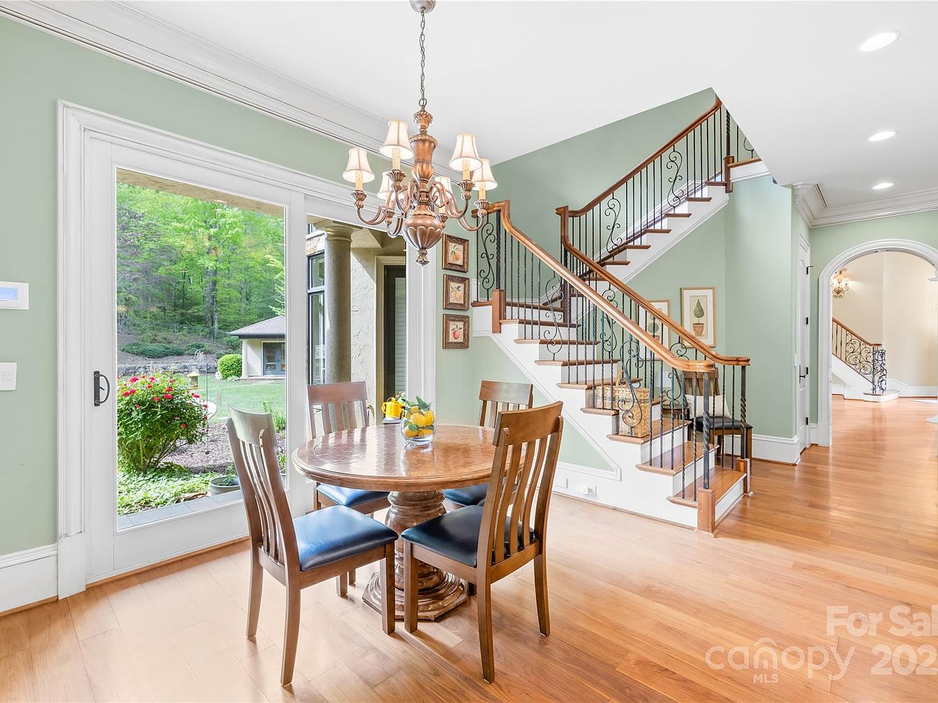 This serene dining nook features a round wooden table surrounded by four chairs with dark blue upholstered seats. Positioned adjacent to large sliding glass doors, the space invites natural light and offers a scenic view of lush greenery outside. The walls are painted a soft muted green that complements the warm honey-toned hardwood flooring. A classic chandelier with elegant fabric lampshades hangs centered above the table, adding warmth and character. The nearby staircase boasts wooden steps with white risers and an ornamental black wrought iron railing, enhancing the room’s refined, timeless ambiance.