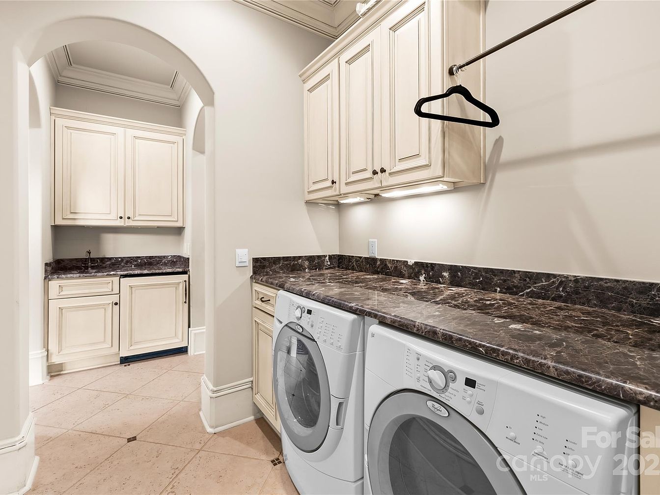 This laundry room features a well-organized layout with front-loading washer and dryer units positioned under a sleek dark brown marble countertop, offering both style and practicality. Cream-colored cabinetry with decorative paneling lines the walls above and below, providing ample storage while complementing the light beige tiled floor with subtle square accents. An arched doorway leads to a secondary space with additional counter space and more cabinetry, maintaining consistent design throughout. The neutral color palette and elegant finishes create a clean, functional area that balances luxury and everyday convenience.