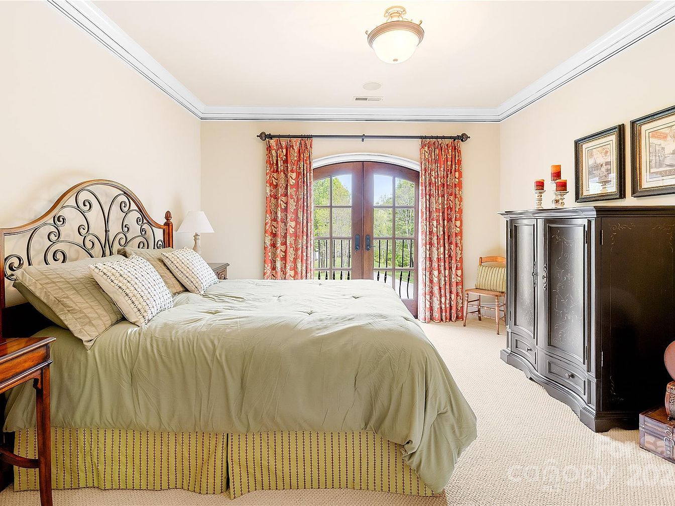 This serene bedroom centers around a large bed adorned with a soft green comforter and two textured accent pillows. The headboard combines intricate wrought iron detailing with warm wood framing, adding an elegant touch. French doors with an arched top allow natural light to pour in, complementing the neutral beige walls and cream carpet. Bold floral curtains in shades of red and beige frame the door, providing a splash of color and pattern. Across from the bed, a dark wood cabinet with carved accents offers storage while displaying tall red candles. The room also features crown molding and simple yet classic light fixtures, creating an inviting, balanced mix of comfort and traditional style.