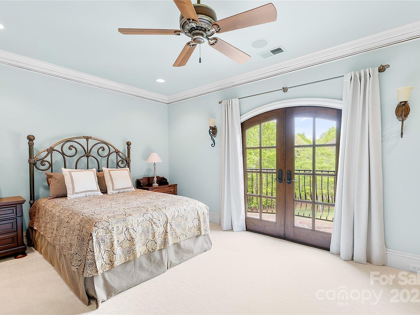 This serene master bedroom features a soft, calming color palette with light blue walls and crisp white trim, enhancing the airy feel of the space. The bed, with its ornate wrought iron headboard and patterned bedding in earthy tones, anchors the room alongside two dark wood nightstands. Natural light floods in through large arched French doors with divided glass panes, leading to a private balcony or outdoor area. Classic wall sconces, a ceiling fan with wooden blades, and simple white curtains complete the elegant and comfortable atmosphere.