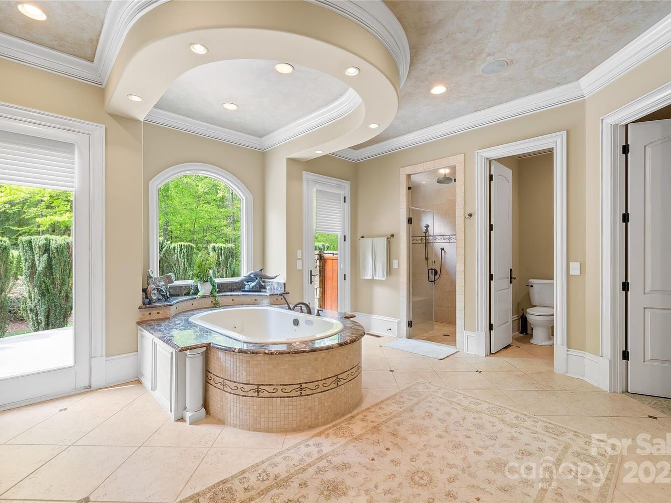 This spacious master bathroom exudes elegance with a neutral color palette featuring warm beige walls and creamy white trim. A grand soaking tub is set in the middle, surrounded by a decorative tiled base and topped with dark granite, creating a striking centerpiece. The curved, recessed ceiling above the tub is highlighted with crown molding and recessed lighting, adding architectural interest and ambiance. Large arched windows provide natural light and a serene view of lush greenery outside. The layout includes a glass-enclosed shower and a private water closet, emphasizing comfort and functionality in a refined setting.