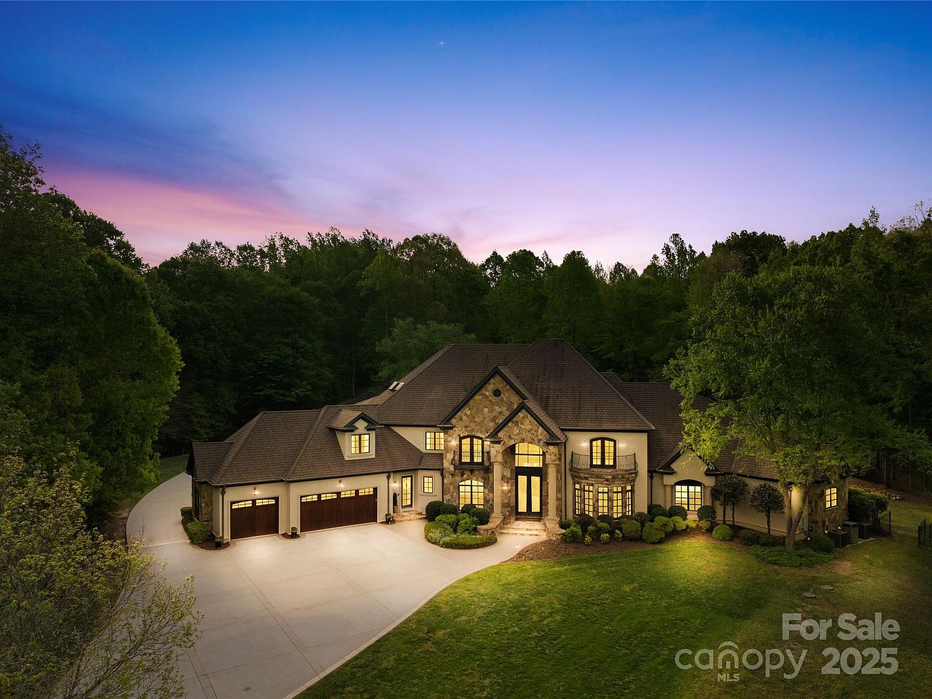 This striking exterior showcases a large two-story home with a steep, multi-pitched roofline and a mix of stone and stucco on the façade, lending a sophisticated yet warm appearance. The grand entryway features tall double doors framed by stone columns and large windows, inviting natural light inside. The driveway curves to a spacious three-car garage with rich wood-toned doors, complementing the natural earth tones of the house. Lush landscaping with manicured shrubs and mature trees surrounds the home, set against a backdrop of dense greenery and a colorful twilight sky enhancing the tranquil ambiance.