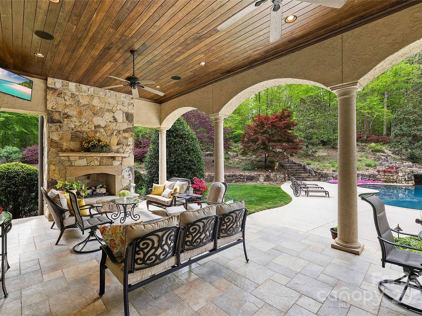 This covered patio offers a serene outdoor living space with a natural stone fireplace as its centerpiece. The ceiling is lined with warm wood planks, complemented by built-in recessed lights and a ceiling fan with wooden blades, creating a cozy ambiance. The floor is paved with neutral-toned tiles that extend seamlessly to the open patio and pool area beyond. The seating consists of wrought iron framed chairs and sofas with plush beige cushions and decorative pillows, arranged to encourage conversation and relaxation. Elegant columns and arched openings frame lush greenery, colorful landscaping, and a glimpse of a tranquil swimming pool.