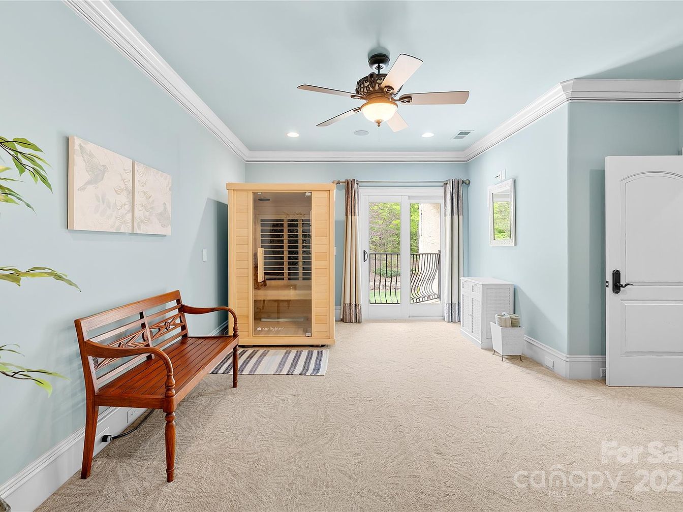This serene space designed for relaxation features soft, pastel blue walls and ceiling that evoke calmness, complemented by plush, light beige carpeting. A wooden bench with intricate details sits against one wall, offering a rustic charm. At the center, an infrared sauna with natural wood tones invites rest and wellness. The room is well-lit by recessed lighting and a ceiling fan with a built-in light fixture. French doors draped with elegant, two-tone curtains open to a balcony with a black wrought-iron railing, bringing in natural light and inviting outdoor views. Crown molding adds a refined architectural touch throughout.