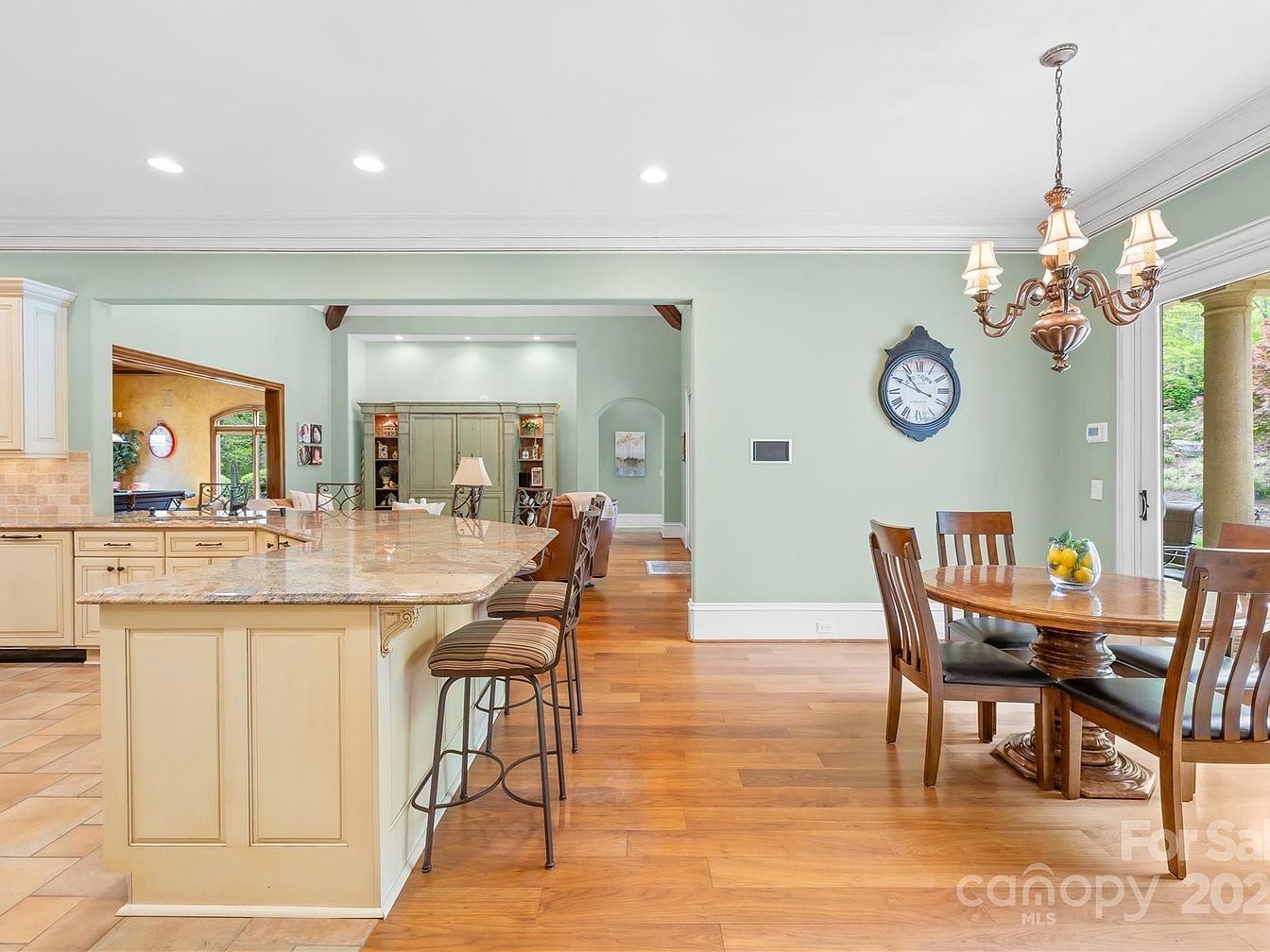 This open-concept kitchen and breakfast nook feature a harmonious blend of warm and soft tones. The kitchen boasts cream cabinetry with detailed paneling paired with a large granite countertop island. The island includes three striped cushioned bar stools, inviting casual dining or socializing. The light green walls add a subtle color splash that complements the golden hardwood flooring flowing seamlessly throughout the space. Elegant recessed lighting brightens the kitchen area, while a classic chandelier hangs over the round wooden breakfast table seating four. A vintage-style wall clock adds character, and large glass sliding doors open to a picturesque outdoor space, extending the welcoming atmosphere.