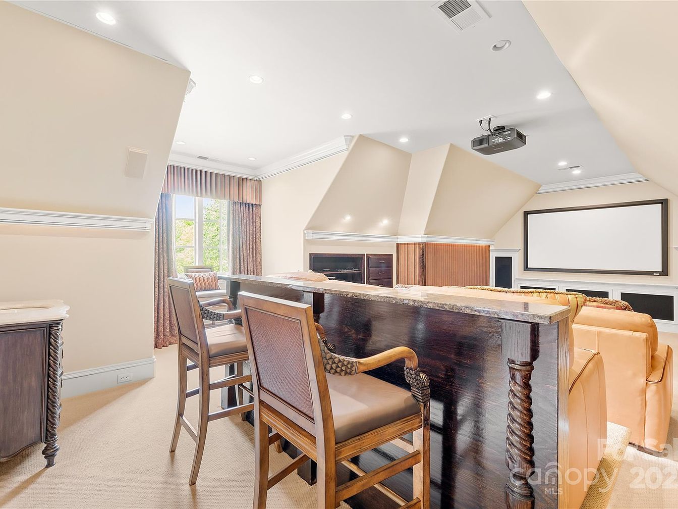 This cozy home theater space features a warm beige wall palette complemented by cream carpet flooring, creating a soft and inviting ambiance. The seating area is arranged with luxurious tan leather couches facing a large projector screen framed in black and white cabinetry. Above, recessed lighting and a ceiling-mounted projector enhance the media experience. A dark wood counter with a polished stone top offers a sophisticated bar-style seating area, accented with carved wooden bar stools that add a touch of classic elegance. Heavy drapes and a nearby window lend natural light and architectural interest to the angled ceiling design.
