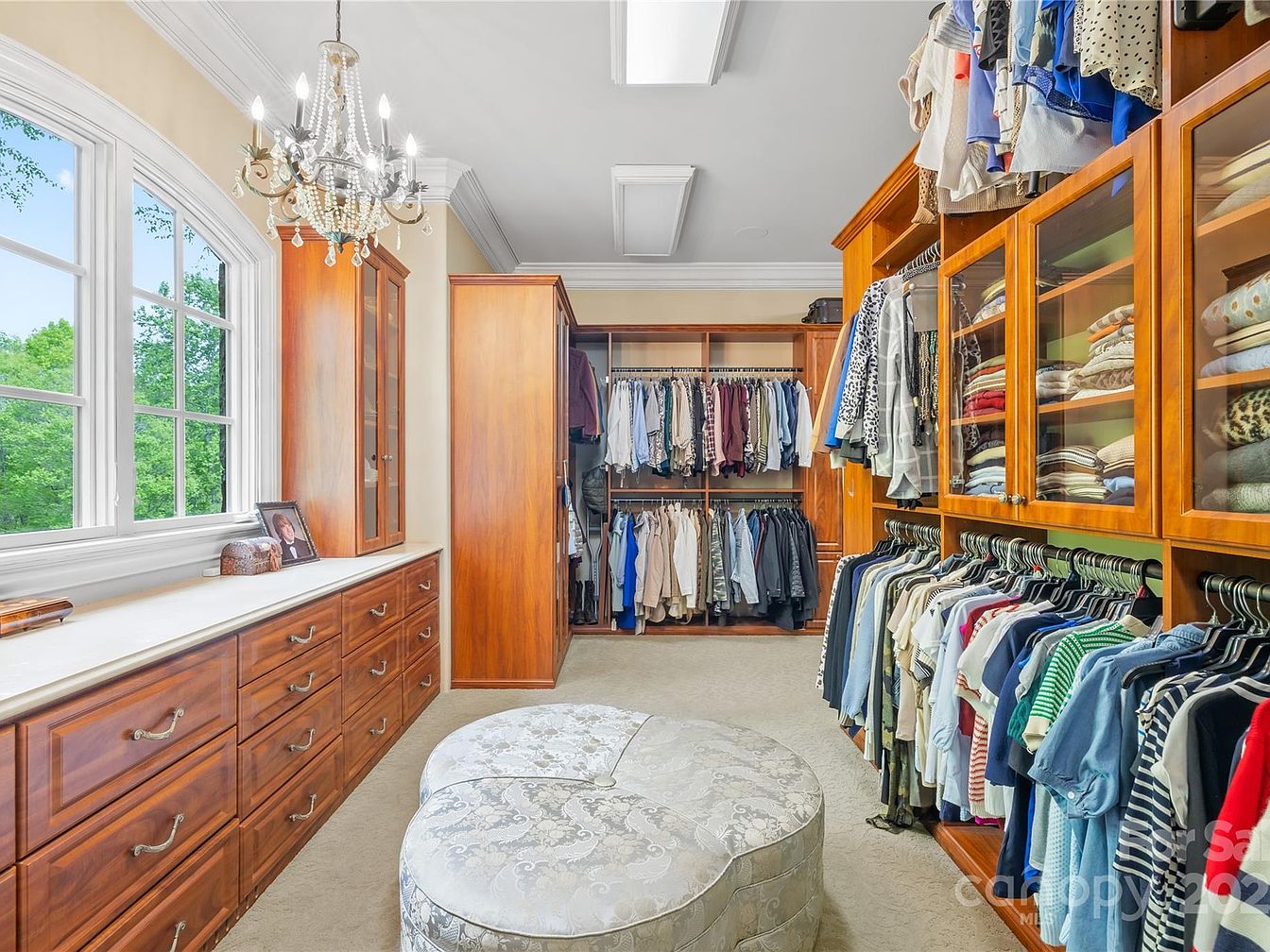 This spacious walk-in closet features a classic design with warm, rich wood cabinetry that provides abundant storage. Multiple hanging rods display an organized collection of clothing, while glass-front cabinets showcase neatly folded garments, adding a touch of elegance. A luxurious, tufted, floral-patterned ottoman sits centrally on the beige carpet, offering a comfortable seating area. Natural light flows in through a large, arched window with white trim, illuminating the space. A crystal chandelier with a vintage flair hangs from the white ceiling with detailed crown molding, enhancing the room’s refined and inviting atmosphere.