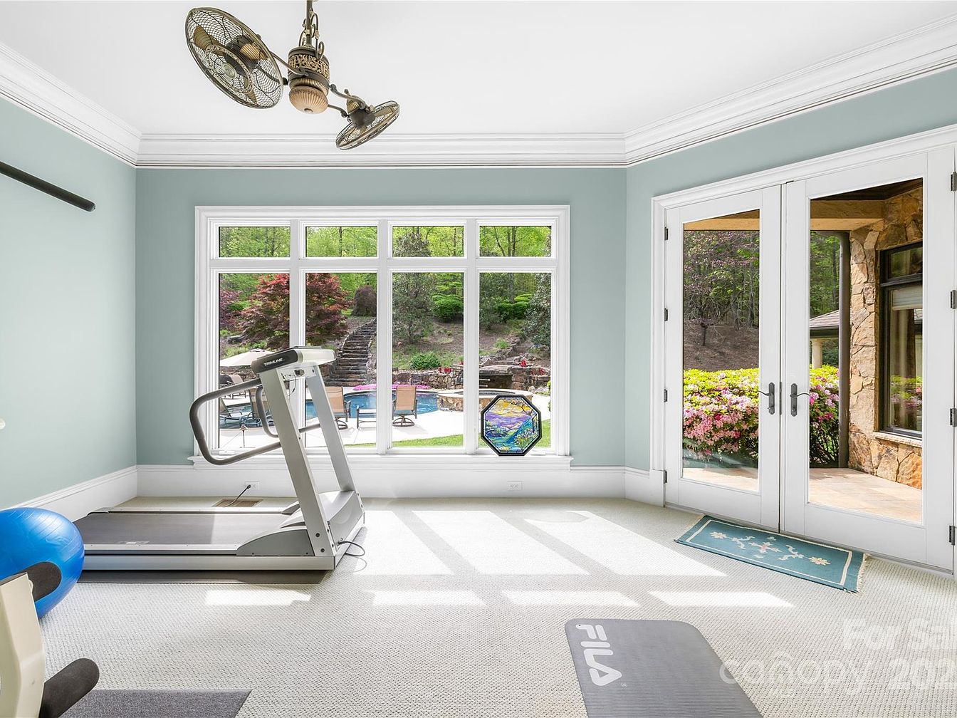 This bright home gym is painted in a calming pale blue, complemented by crisp white trim and ceiling moldings that add a touch of elegance. A large window wall floods the space with natural light, offering a serene view of a lush garden with stone steps, colorful foliage, and a pool area beyond. Glass French doors open to an outdoor patio framed in natural stone, blending indoor and outdoor living. Equipment includes a treadmill and a yoga mat on soft, light carpet flooring, creating a welcoming environment for exercise and relaxation.