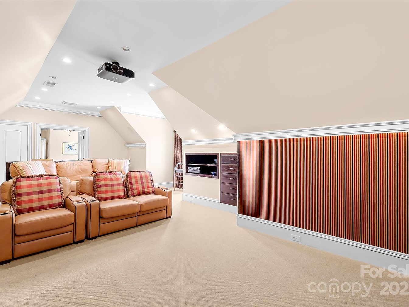 This cozy media room features a tiered seating arrangement with two rows of plush leather recliners in a warm caramel shade, complemented by red and beige plaid cushions that add a pop of pattern. The sloped ceiling with recessed lighting and a mounted ceiling projector highlight the room’s design as a dedicated home theater. Soft beige carpeting runs throughout the space, paired with neutral walls that maintain a bright, inviting atmosphere. A built-in media cabinet and a striped accent panel along one wall provide both storage and decorative texture, creating an ideal entertainment nook.
