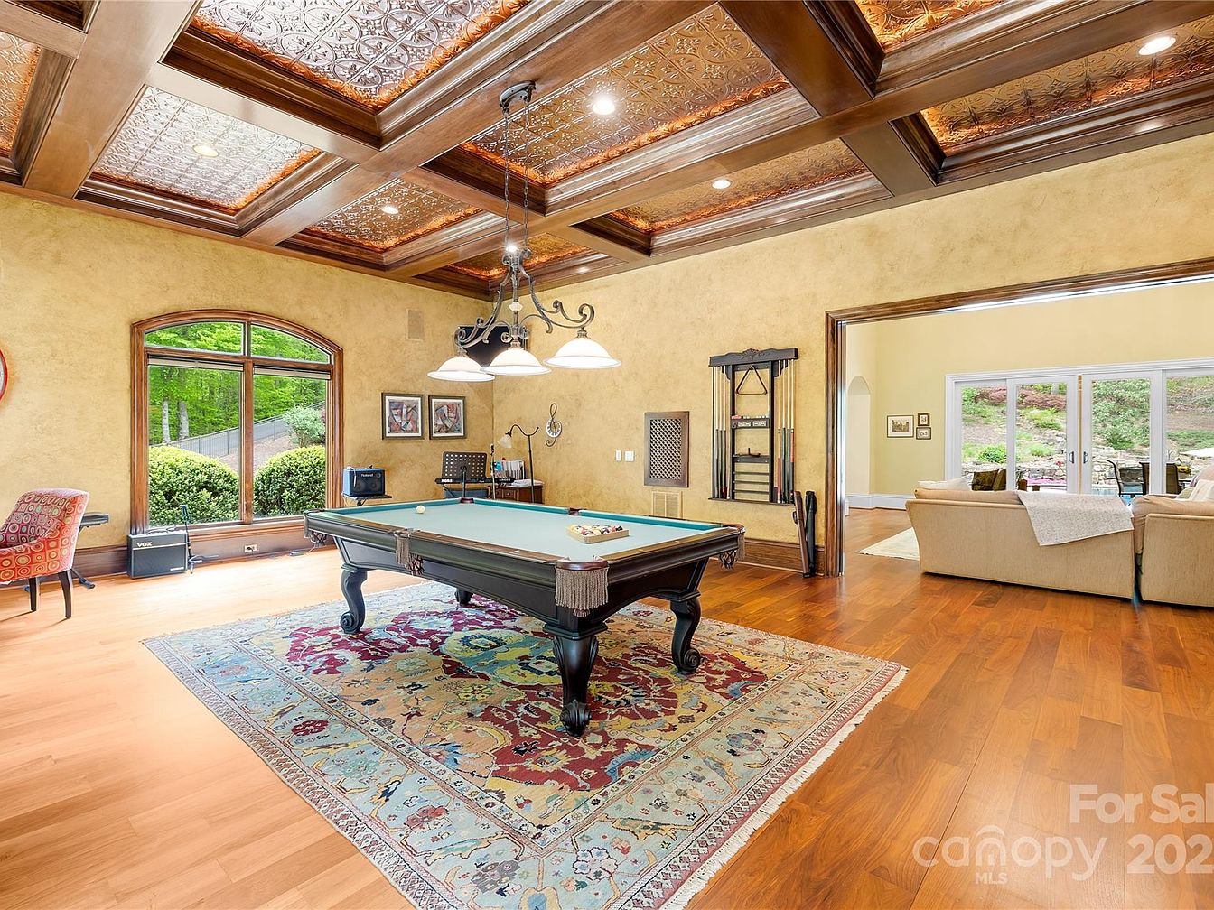 This spacious game room centers around a classic black pool table, positioned on a large, intricately patterned area rug in shades of red, blue, and beige. The room is warmed by light hardwood floors and walls finished in a textured, muted yellow plaster. An elegant coffered ceiling with rich wood beams and metallic decorative panels adds a touch of vintage luxury, complemented by a wrought iron chandelier with three frosted glass shades hanging directly over the table. Large arched windows offer greenery views, while an open doorway leads to a cozy beige sofa sitting area with glass doors opening to an outdoor patio.