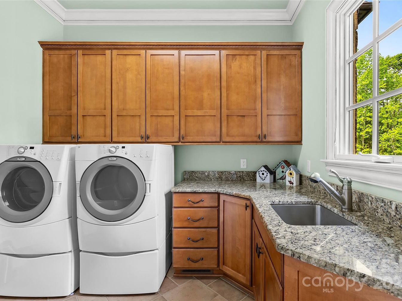This laundry room features a practical layout with a side-by-side white front-loading washer and dryer. Above and beside them, a suite of warm honey-toned wooden cabinets offers ample storage, topped with detailed crown molding for a refined finish. The countertops are speckled granite, providing a durable and elegant workspace that extends beneath a large window, bathing the area in natural light and framing a lush green outdoor view. Soft mint green walls create a calming atmosphere, while a stainless steel sink sits conveniently within the countertop, blending function with classic design effortlessly.