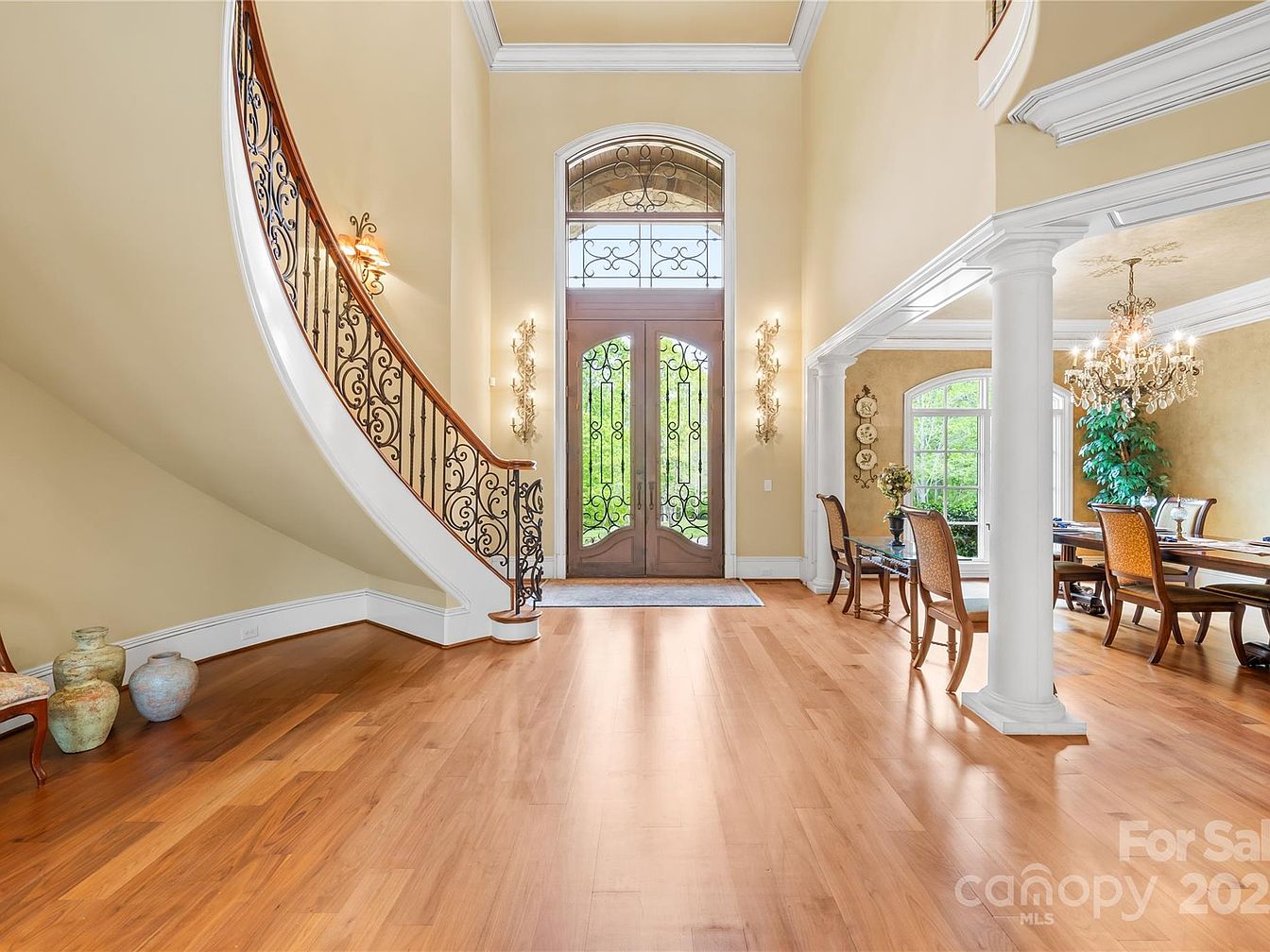 This spacious entryway features warm, light wooden flooring that extends seamlessly into an adjoining dining room. The focal point is a grand, curved staircase with intricate black wrought-iron balusters and a polished wood handrail that adds elegance. Soft beige walls create a welcoming atmosphere, complemented by white crown molding and baseboards that add architectural refinement. The double front doors include decorative iron detailing and an arched glass transom that floods the space with natural light. To the right, an open dining area framed by white columns boasts a crystal chandelier, formal dining set, and a large window overlooking greenery. Wall sconces illuminate the entry with warm ambient light, culminating in a refined and inviting introduction to the home.