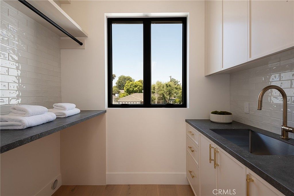 This compact laundry room features a sleek, modern design with clean lines and functional layout. White cabinetry with gold handles adds elegance while providing ample storage. The black countertops contrast sharply with the white subway tile backsplash, which adds texture and subtle shine to the space. A deep sink with a contemporary bronze faucet is positioned beneath a large window framed in black, allowing natural light to brighten the room and offering a pleasant outdoor view. The light wooden flooring warms the space, and neatly folded white towels on the side counter enhance the room’s fresh and organized aesthetic.