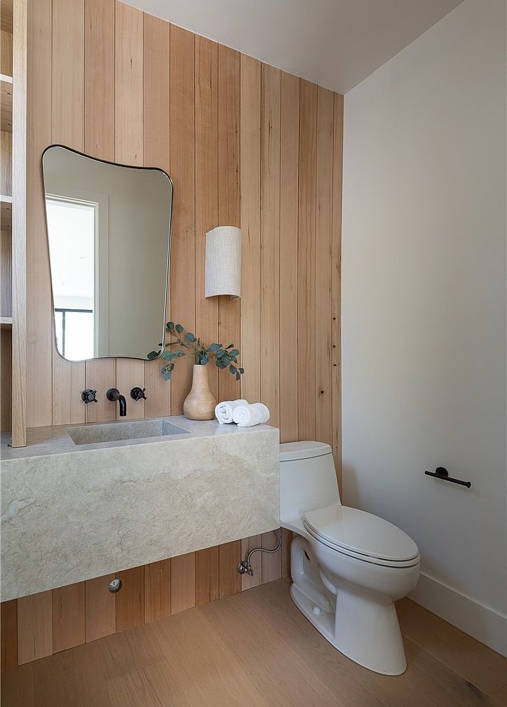 This bathroom area exemplifies modern rustic charm through its natural wood paneling, which extends vertically behind a floating stone sink console. The stone console, in a light beige tone, contrasts elegantly with the warm wood while maintaining a neutral palette. A uniquely shaped mirror with soft curves adds character above the matte black faucet, which is built into the wall for minimalist appeal. The white toilet sits against a clean white wall featuring a sleek black toilet paper holder, emphasizing a simple, balanced design. Decorative minimalism is completed with a small vase of eucalyptus and rolled white towels, creating a calming, spa-like ambiance.