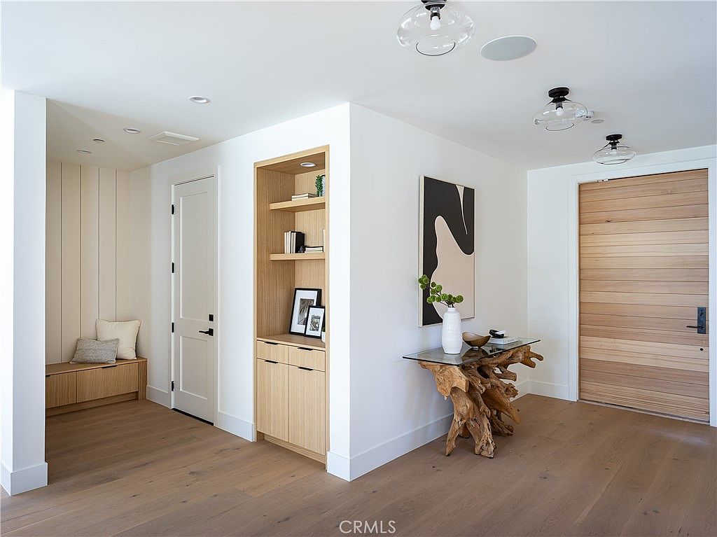 This entryway features a clean, minimalist design with white walls and light oak flooring that adds warmth to the space. A striking natural wood front door complements the wood tones used throughout. To the left, a built-in alcove serves as a cozy sitting nook with vertical paneling and a wooden bench topped by neutral throw pillows, inviting guests to pause comfortably. Adjacent to the door, an inset shelving unit with cabinets below showcases framed art and books, creating a subtle decorative display. A unique console table with a sculptural driftwood base topped by a glass surface adds artistic flair, under a bold abstract black and beige wall art. Glass pendant lights with black fittings hang from the ceiling, contributing to the airy and sophisticated ambiance.