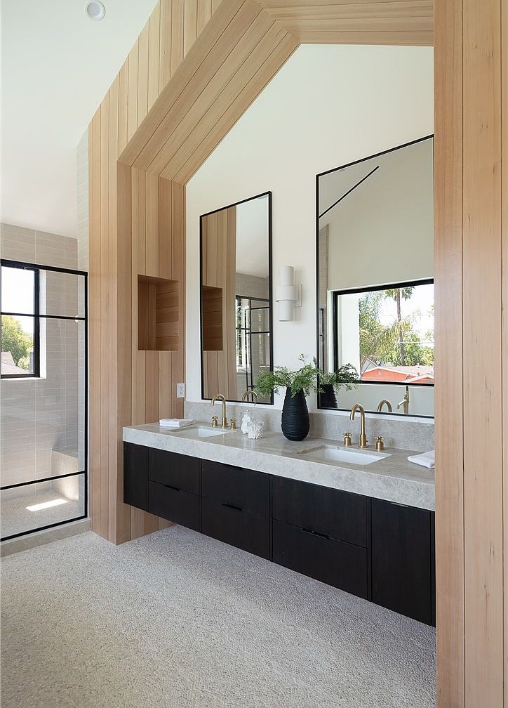 This bathroom features a sleek, modern double vanity with a floating black cabinet beneath a solid, light-colored countertop. Two undermount sinks are paired with elegant brushed gold faucets, emphasizing a blend of luxury and simplicity. Above each sink are tall rectangular mirrors with slim black frames, amplifying the vertical lines within the space. Light wood paneling frames the vanity area with a unique angled design that creates visual interest and warmth, contrasting with the neutral walls. The beige textured flooring adds softness. Adjacent large windows framed in black provide natural light and highlight contemporary clean lines throughout.