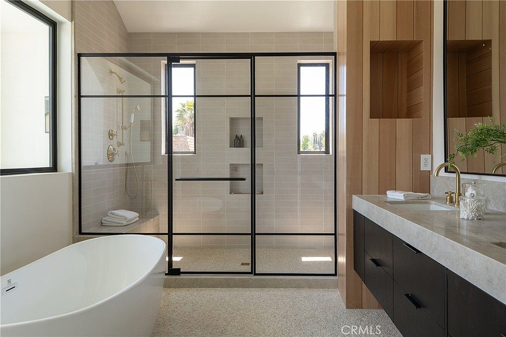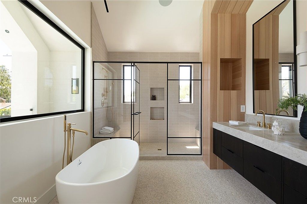 This spacious bathroom blends contemporary elegance with natural warmth. The centerpiece is a sleek, freestanding white bathtub paired with a stylish gold-toned faucet, positioned by a large window that invites abundant natural light. Adjacent is a glass-enclosed shower featuring black metal framing, complementing the modern minimalist aesthetic. Light beige tiles line the shower walls, continuing the neutral palette. The vanity area contrasts with rich black cabinetry beneath a smooth light stone countertop, topped with dual gold faucets. Warm wood paneling adds texture and coziness to one wall, with built-in niches enhancing functionality. Overall, the design balances luxury and tranquility in a clean, airy space.