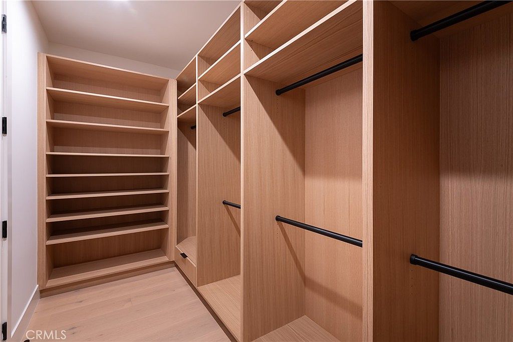 This spacious walk-in closet offers a clean, modern layout focused on functionality. Light natural wood forms the entirety of the shelving and storage units, lending warmth and a sleek, cohesive aesthetic. Multiple shelves on the left provide ample space for folded clothes or accessories, while the right side features tall vertical compartments equipped with black metal hanging rods for garments. The arrangement maximizes storage capacity in a streamlined way, complementing the light wood flooring and white walls to create a bright, organized, and elegant dressing area.