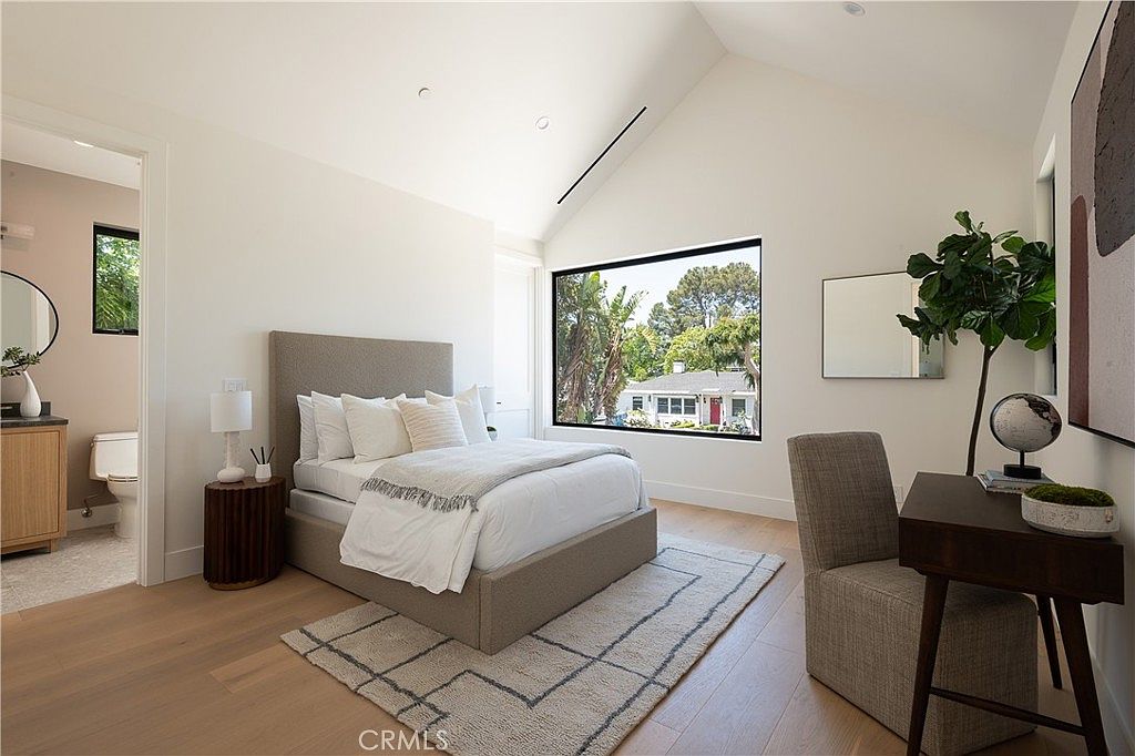 This bright bedroom features vaulted ceilings and clean white walls that create an airy, spacious feel. The focal point is a taupe upholstered bed with crisp white bedding layered with textured throw pillows and a fringed blanket. Natural light floods through a large, black-framed window, offering views of lush greenery and neighboring homes. A geometric area rug in neutral tones anchors the bed on the light hardwood floor. To the right, a wooden desk paired with a cushioned chair creates a cozy workspace, accented by a potted plant and minimal decorative items for a modern, serene aesthetic. An adjacent doorway leads to an en suite bathroom with wooden cabinetry and a round mirror, continuing the sophisticated, tranquil vibe throughout.