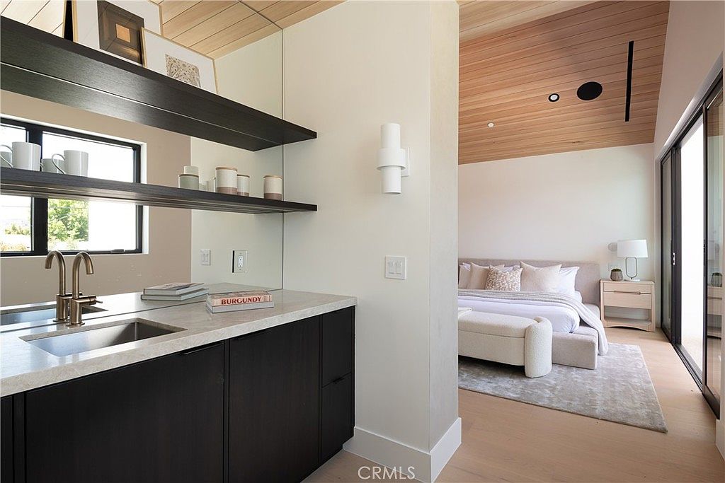 This serene space combines a sleek wet bar area with a cozy bedroom visible beyond. The wet bar features dark cabinetry topped with a light marble countertop, complemented by contemporary matte brass fixtures and two minimalist open shelves holding modern white and neutral-toned jars and cups. The back wall is mirrored, enhancing the sense of space and light. The bedroom boasts soft, neutral tones with a plush upholstered bed, a matching bench at its foot, and a muted gray area rug on light wood floors. A wood-paneled ceiling adds warmth, beautifully contrasted with white walls and expansive sliding glass doors that bring in natural light and outdoor views.