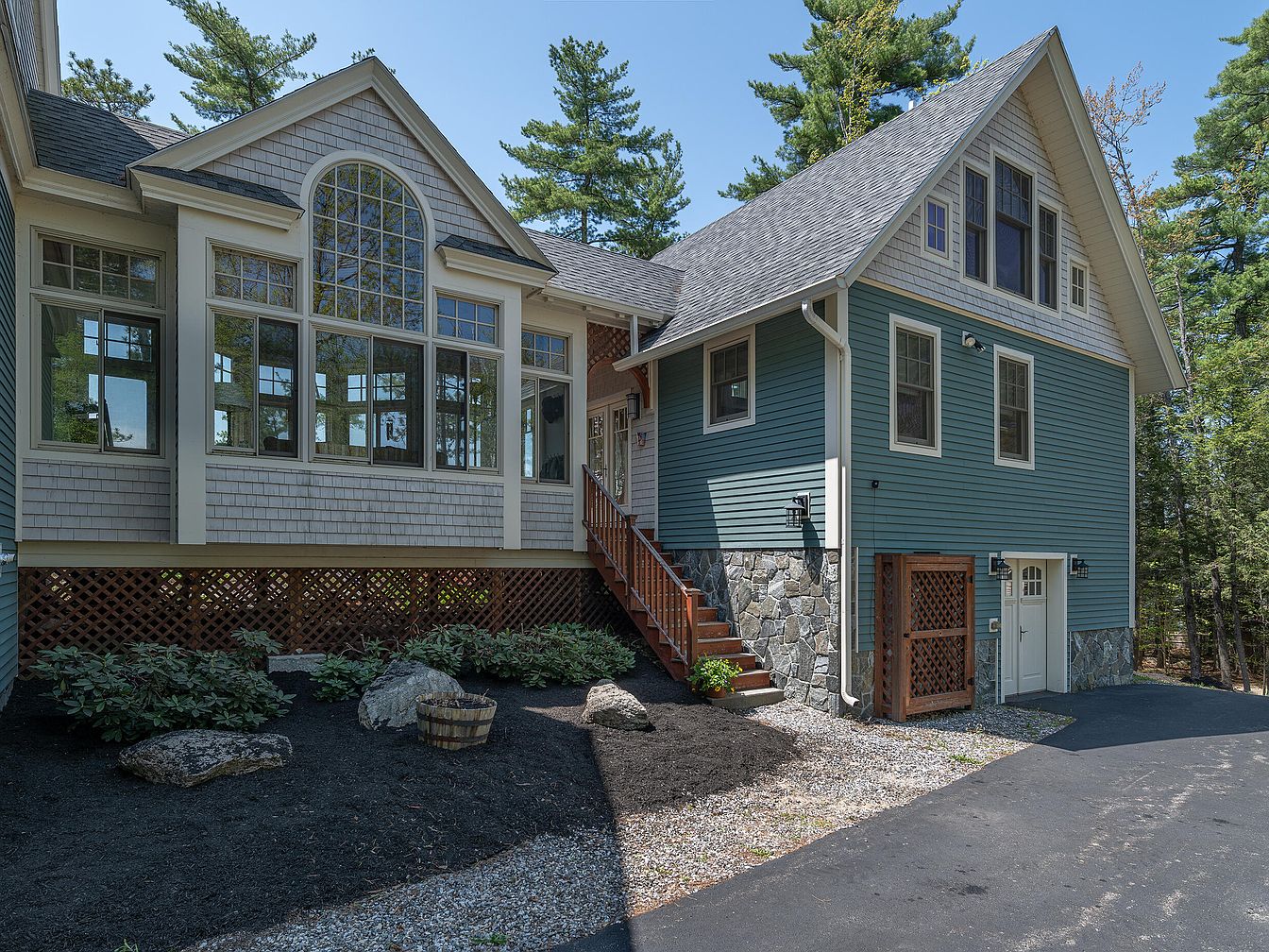 This side exterior features a charming combination of textures and colors that highlight the classic New England style. The lower portion of the house is clad in natural stone, while the upper walls showcase a blue horizontal siding complemented by muted gray shingle siding at the gables and around prominent large windows. The expansive windows with white trim, including an arched central pane, provide ample daylight to the interior. A small wooden staircase with dark reddish-brown railings leads up to a secondary entrance, framed by decorative corbels. Dark mulch landscaping with green shrubs and natural stones adds to the inviting curb appeal, set against a backdrop of tall evergreen trees and a smooth asphalt driveway.