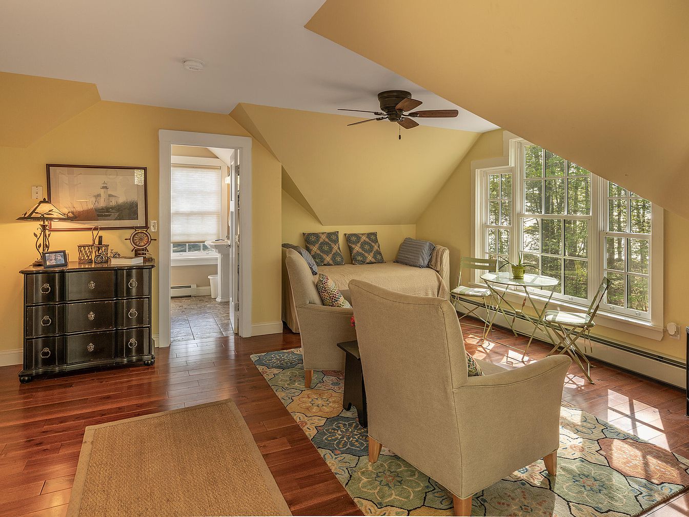 This charming attic nook features soft yellow walls that complement the warm honey-toned hardwood floors. An inviting seating arrangement includes two beige armchairs centered on a floral patterned area rug and a small daybed accented with patterned cushions, nestled under the sloped ceiling. A compact glass table with folding chairs sits beside the large, multi-paneled windows that offer a bright, serene forest view. The black chest of drawers with decorative hardware and a classic lamp adds a vintage touch. Subtle architectural details like white crown molding and a ceiling fan complete this sunlit, intimate retreat.