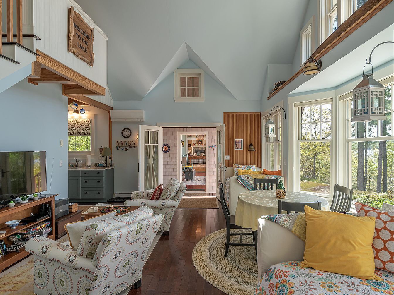 This inviting living space features vaulted ceilings painted in soft pastel blue, enhancing the airy and open atmosphere. Warm wood flooring contrasts beautifully with the light walls, creating a balanced and welcoming environment. Patterned armchairs and a cushioned bench adorned with colorful, floral prints and solid pillows bring a cozy, eclectic charm. An adjacent small kitchen nook with sage green cabinetry peeks from the left. Large windows flood the room with natural light while framed lanterns hang, emphasizing the scenic views beyond. A round dining table with a neutral tablecloth and mismatched chairs anchor the sitting area, perfect for casual gatherings. Rustic accents like the “Welcome to the Lake” sign and natural textures on rugs add to the relaxed, lakeside cottage feel.