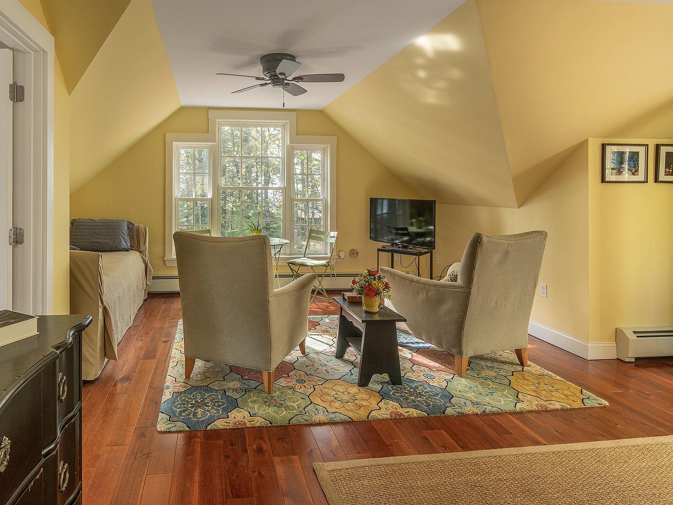 This inviting sitting area is nestled beneath angled, sloped ceilings painted a soft yellow, enhancing the warmth and charm of the room. Polished hardwood floors in a rich, reddish tone complement the colorful patterned rug that anchors the furniture. Two beige upholstered armchairs face each other across a small, dark wood coffee table adorned with fresh flowers. A compact TV rests on a minimalist stand in the corner, while natural light streams in through a triptych of white-framed windows. A daybed with earth-toned cushions lines one wall, accompanied by a small dining set near the windows, creating a cozy, multi-functional retreat.