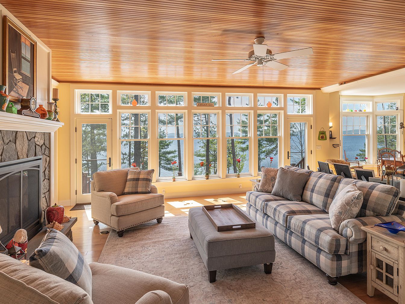 Warm and inviting, this living room features a harmonious blend of natural tones with its wooden ceiling and cream-yellow walls. Floor-to-ceiling windows stretch across the room, showcasing stunning bay views framed by tall trees. The seating area includes a plaid-patterned sofa and neutral-toned armchairs, arranged around a cushioned ottoman serving as a coffee table. A stone fireplace anchors one corner, enhancing the cozy ambiance. Decorative details like a ceiling fan, a soft area rug, and strategically placed potted plants by the windows contribute to a serene, nature-inspired atmosphere perfect for relaxation and socializing.