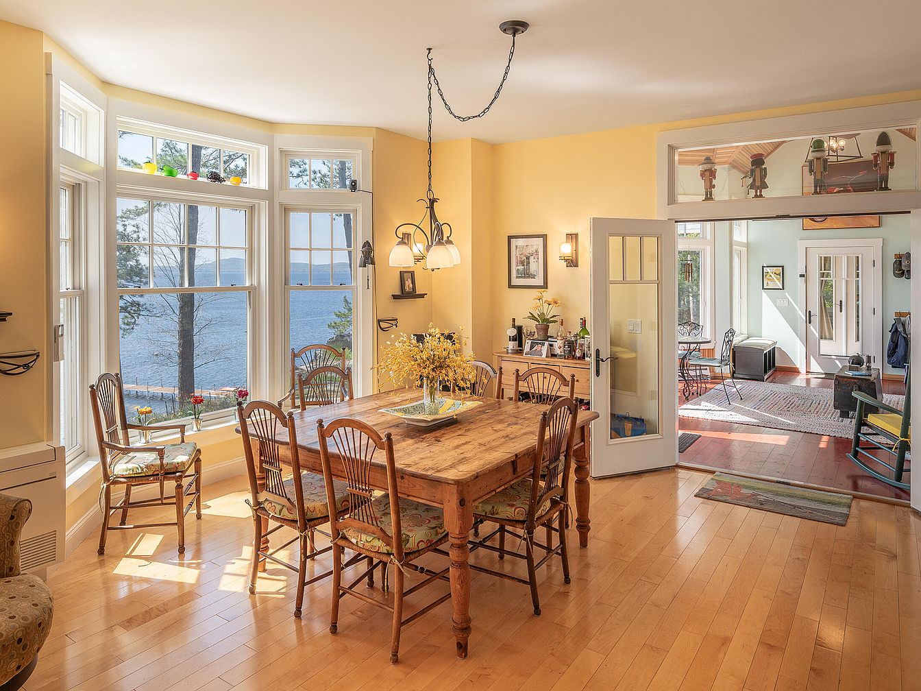 This warm dining area features large, multi-pane windows that frame a stunning lake view, bathing the room in natural light. The walls are painted a soft yellow, complementing the honey-toned hardwood floors. A rustic wooden dining table takes center stage, surrounded by six matching chairs with patterned seat cushions, offering a cozy yet elegant setting for meals. A traditional chandelier with frosted glass shades hangs overhead, adding charm. The adjoining room is visible through a glass-paneled door and transom showcasing decorative nutcracker figurines, enhancing a nostalgic, inviting ambiance. Simple shelving and tasteful wall art complete the space.