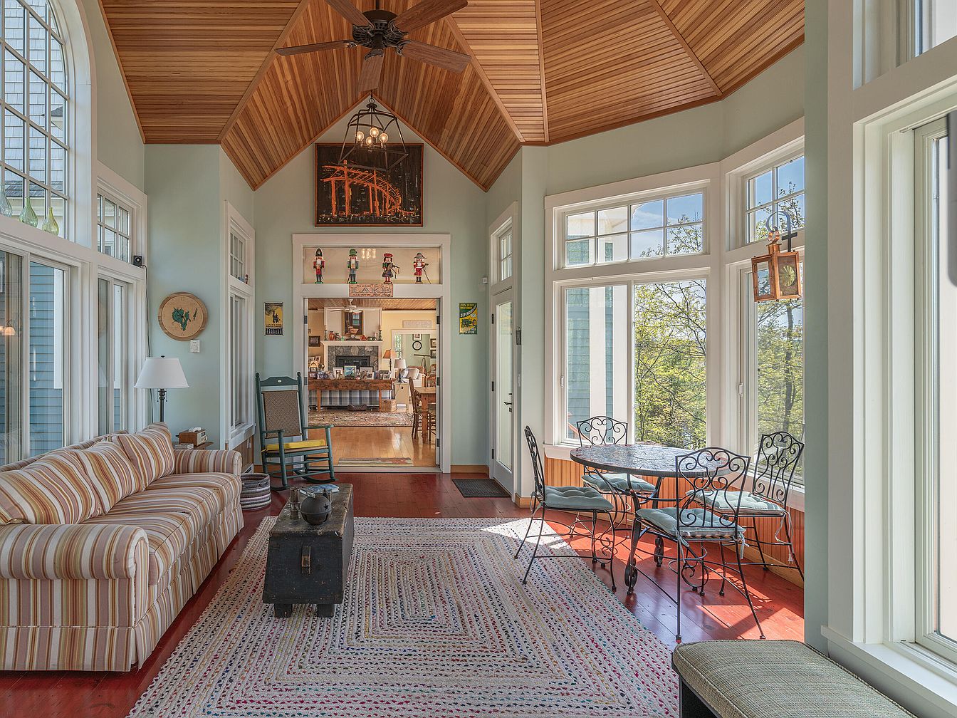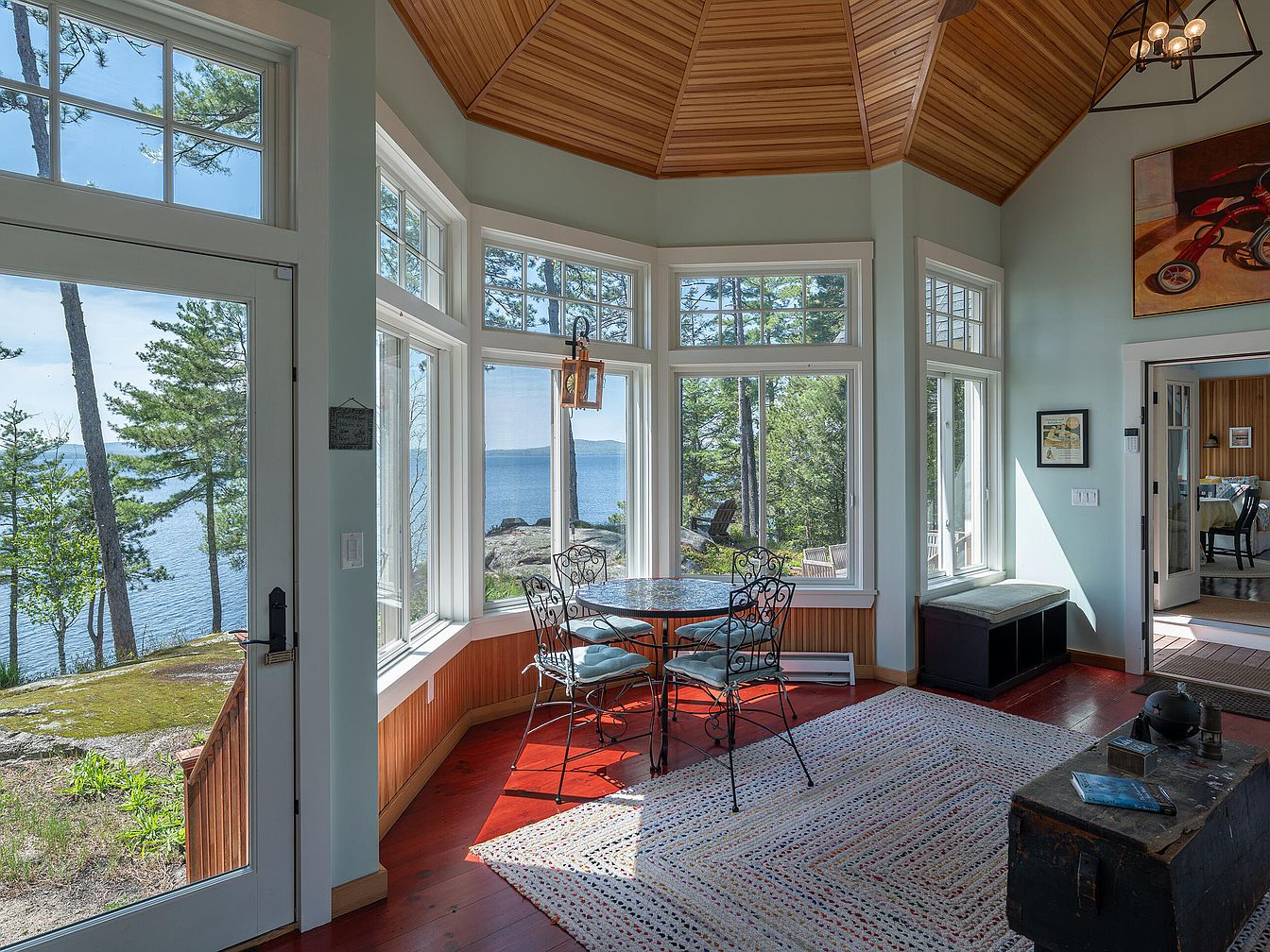 This sunroom is a bright, inviting space that perfectly combines comfort and nature. It features a distinctive octagonal wooden ceiling with warm tones that contrast beautifully with the light sage walls. The room is framed by large windows on three sides, offering panoramic views of lush trees and a serene lakeside scene. A round wrought-iron dining table with cushioned chairs sits atop a textured, multicolor braided rug on rich reddish wood flooring. Natural light floods the area, creating a peaceful spot for morning coffee or casual meals, seamlessly blending indoor comfort with the outdoors.