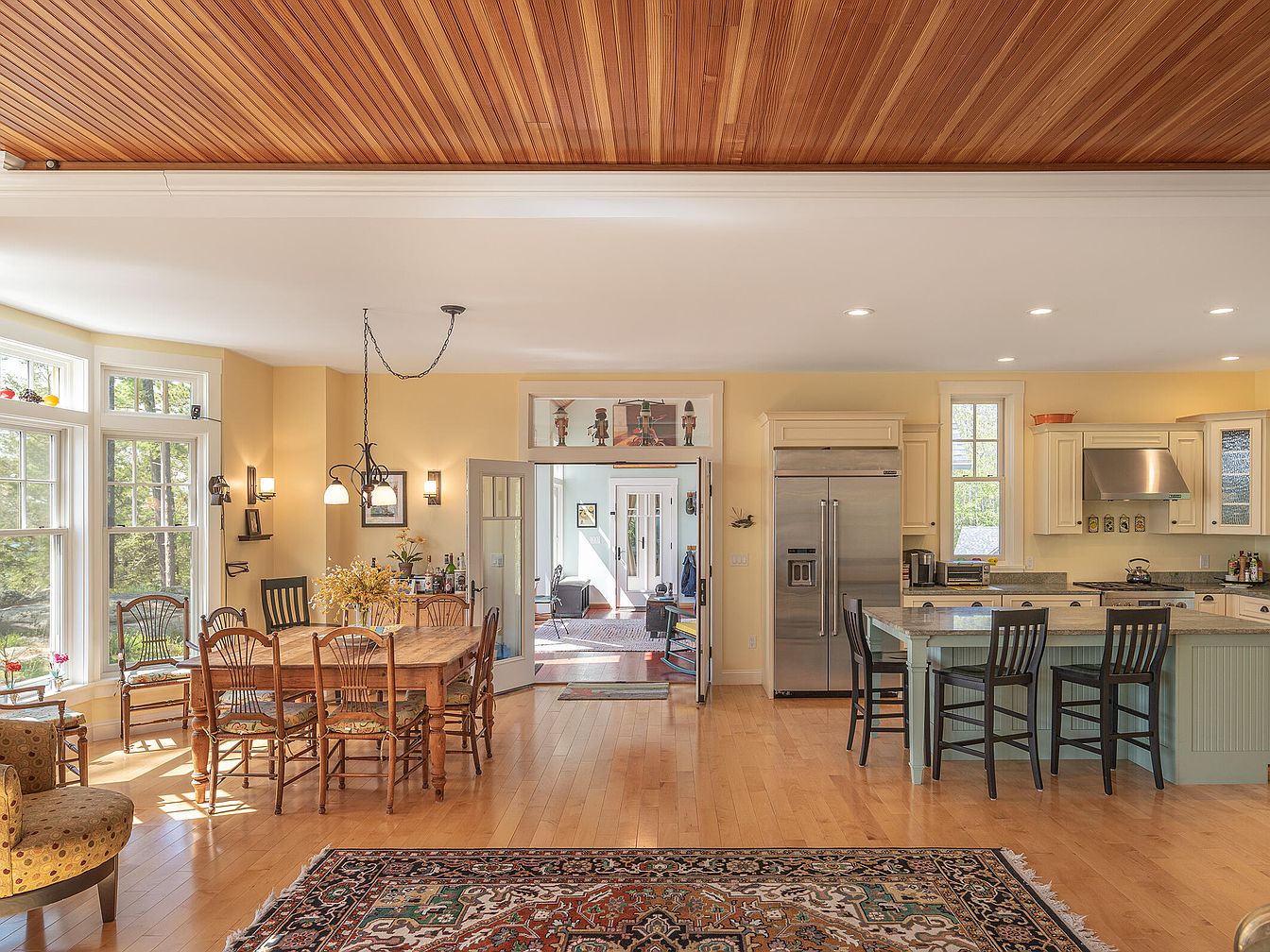 This spacious open concept area integrates the dining and kitchen spaces seamlessly. Warm yellow walls complement natural wood flooring and a rich wooden ceiling panel that adds texture and warmth overhead. The dining area features a rustic wooden table surrounded by classic spindle-back chairs, illuminated by a wrought iron chandelier. Adjacent to this, the kitchen boasts white cabinetry and a pale green island with marble countertops, paired with black wooden bar stools for casual seating. Large windows bring in natural light, enhancing the bright, inviting atmosphere. The wide double doors lead to a sunlit adjoining room, adding depth and connectivity to the layout.