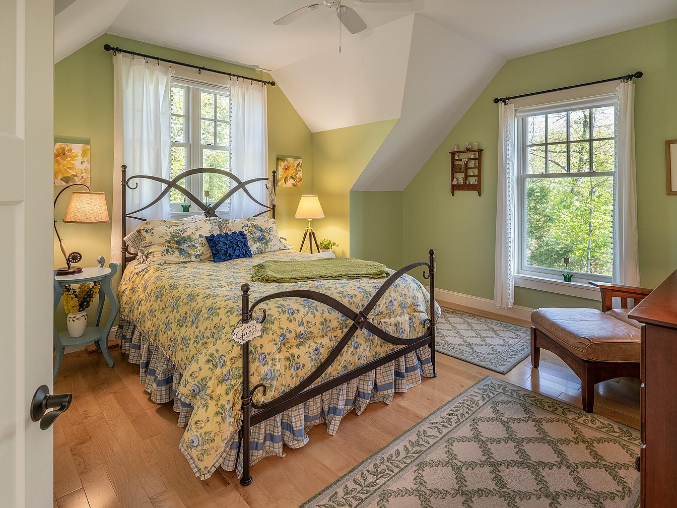 This inviting guest bedroom features soft green walls paired with natural wood flooring, creating a warm, peaceful ambiance. The metal bed frame with its curved design complements the floral bedding in yellow tones with blue accents, enhancing the room’s country charm. Light filters through two large windows draped with sheer white curtains, brightening the space. The room includes a small blue nightstand with a rustic lamp and fresh flowers, alongside a wooden dresser and a leather chaise lounge in the corner for added comfort. Subtle decorative elements, such as framed artwork and a miniature wall shelf, add personalized touches that feel welcoming and homey.