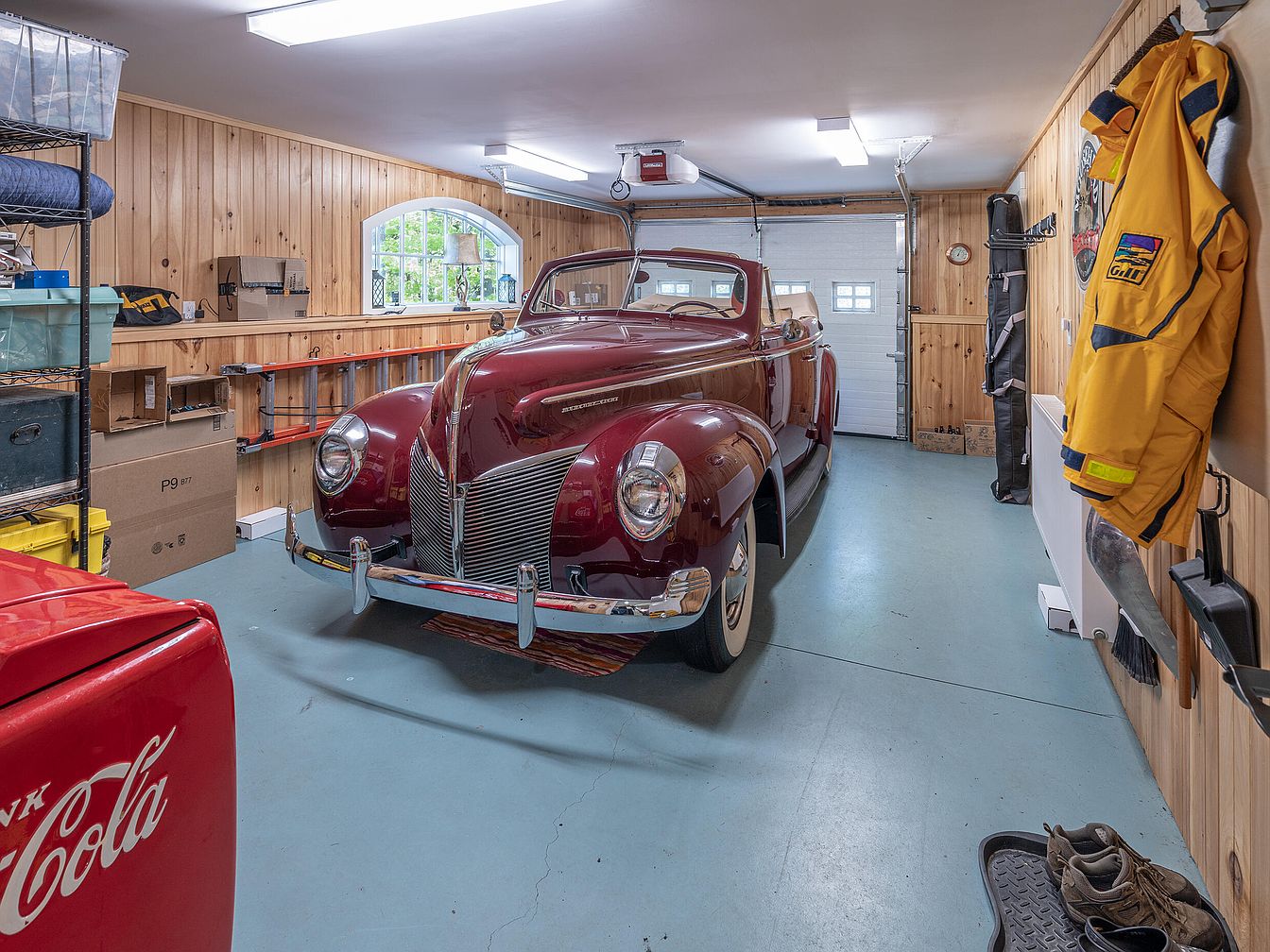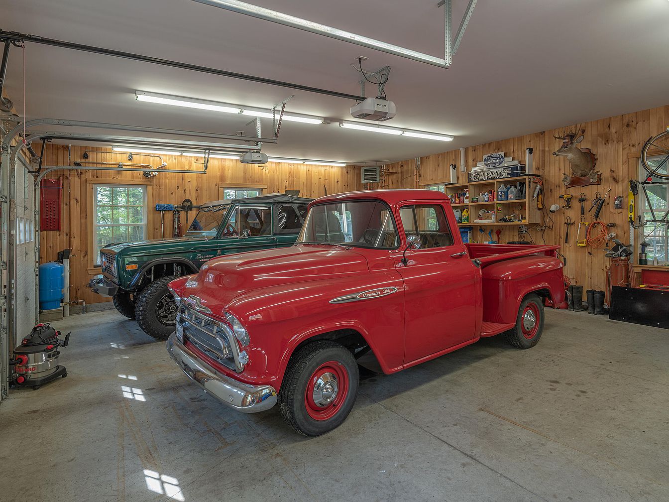 This spacious garage features a polished concrete floor, offering durability and easy maintenance. Warm, natural wood paneling covers the walls, enhancing the rustic and inviting atmosphere. Two vintage vehicles, a vibrant red Chevrolet 3100 pickup and a deep green classic Ford Bronco, are parked side by side, highlighting the homeowner’s passion for classic cars. The ceiling sports fluorescent tube lighting that ensures ample brightness throughout the space. Practical elements like organized shelves stocked with automotive supplies, mounted tools, and a hunting trophy on the wall convey a blend of functionality and personal interests.