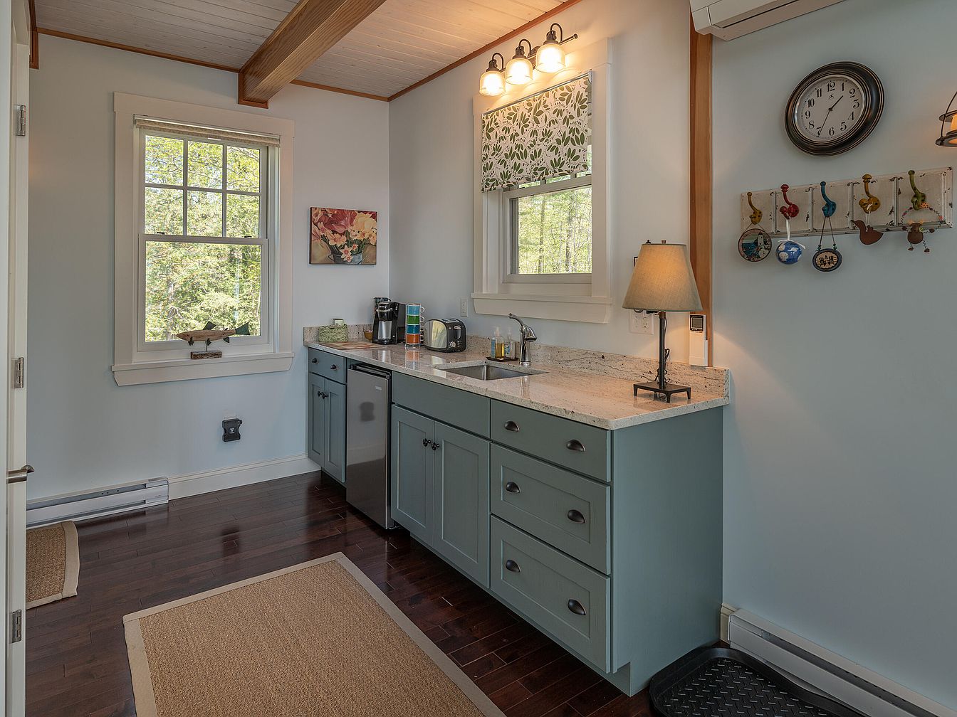 This space features a long countertop with sage green cabinetry beneath, accented by black hardware and a bright granite surface. The layout is linear, with a small sink and appliances like a compact refrigerator, coffee maker, and toaster neatly integrated. Two windows let in ample natural light, one above the sink partially covered by a botanical patterned roman shade, and another to the left with a small decorative sculpture on the sill. A warm table lamp on the countertop adds soft lighting, complementing the exposed wooden ceiling beams and polished dark hardwood floors, creating a cozy, cottage-like atmosphere.
