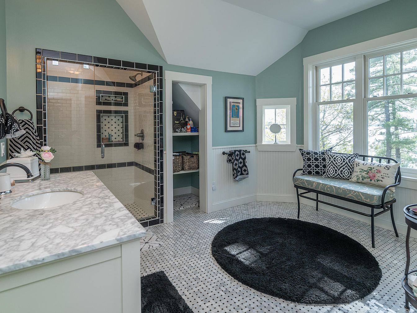 This bathroom blends functionality and comfort with elegant design. Soft teal walls contrast against classic white wainscoting and mosaic-tiled flooring, enhancing the airy ambiance. A large glass shower with black-bordered white subway tiles acts as a visual centerpiece, while the marble countertop adds a luxurious touch. Ample natural light pours through wide multi-pane windows, brightening the space and highlighting subtle décor, such as patterned black and white towels and cushions. A cozy seating nook with a cushioned bench invites relaxation, making the room feel more inviting and versatile beyond its practical use.