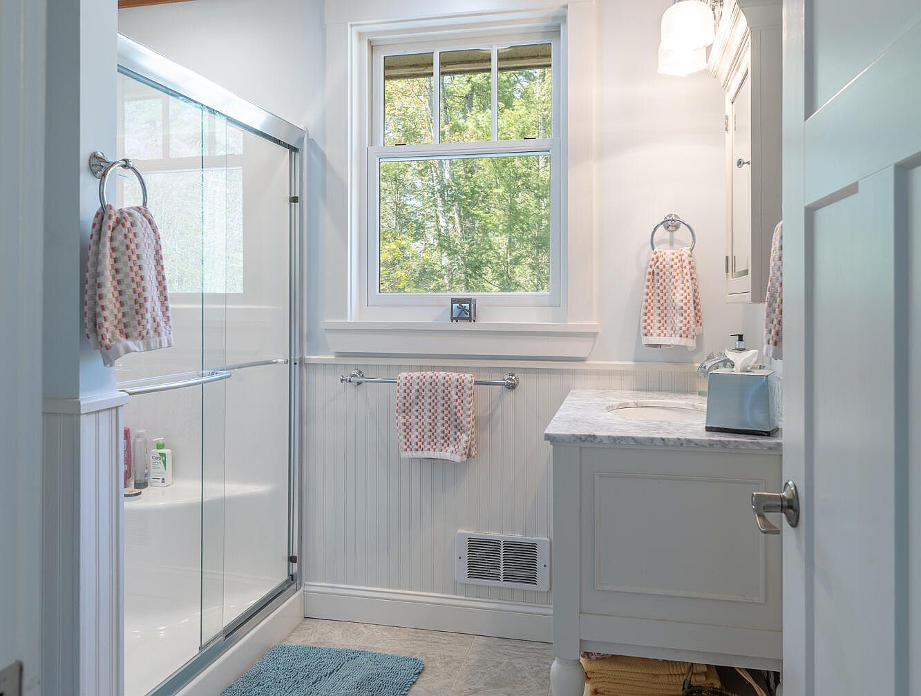 This compact bathroom boasts a clean, airy ambiance highlighted by soft white walls and beadboard wainscoting. A frosted glass sliding shower door opens to a simple shower stall with built-in shelving. Natural light floods the space through a large, divided window featuring a classic grid design, offering a view of green foliage outside. Polished chrome fixtures, including towel rings and a bar, hold matching textured towels in warm pastel tones. The white vanity with a marble countertop adds subtle elegance, complemented by a light blue rug on the gray tile floor. Overall, the design cleverly combines practicality with subtle charm.