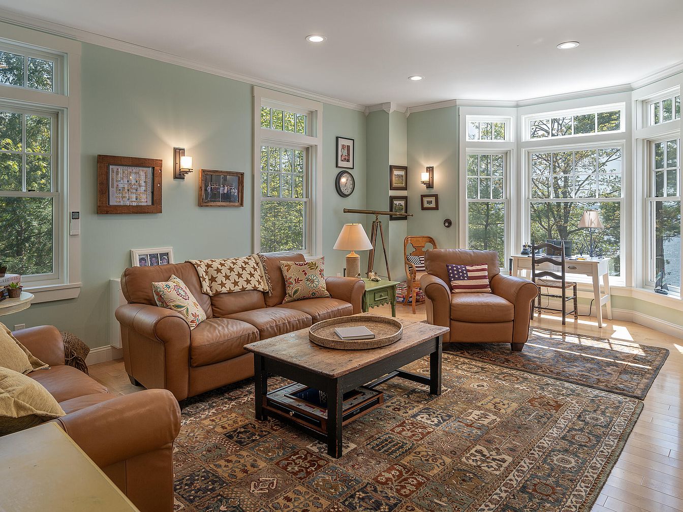 This cozy living room space features a warm and inviting arrangement centered around two leather sofas and a matching armchair in rich caramel tones. A large, intricately patterned area rug in earthy hues anchors the seating group, complementing the natural wood floors. The walls are painted a soft sage green, creating a calm backdrop for an eclectic mix of framed art and a vintage-style wall clock. Natural light floods the room through expansive multi-pane windows, including a bright bay window area furnished with a simple white writing desk and chair. Decorative elements like a tripod telescope, table lamp, and star-patterned throw blanket add character and a touch of rustic charm. Recessed ceiling lights and wall sconces provide layered, ambient lighting for a comfortable and inviting atmosphere.