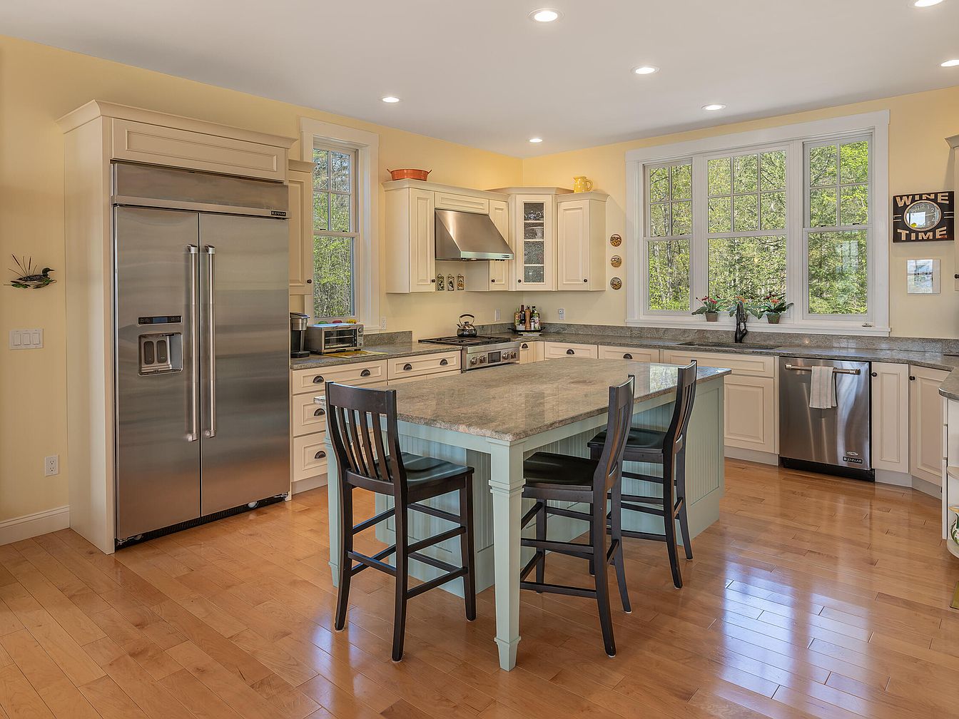 This spacious kitchen features a large center island with a smooth granite countertop in muted gray tones, providing both functionality and an inviting gathering spot. The island base is painted a soft pastel blue, adding a gentle contrast to the creamy white cabinetry that lines the kitchen perimeter. Stainless steel appliances, including a tall refrigerator and dishwasher, complement the modern farmhouse vibe. The warm honey-colored hardwood floors add warmth and depth. Multiple windows flood the room with natural light, highlighting the thoughtful layout and cozy breakfast bar with three dark wooden chairs offering casual seating.