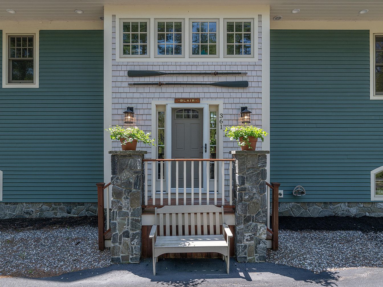 This charming front entrance combines classic and coastal design elements. The doorway is centered and painted in a subdued gray, framed by white trim and side windows that allow natural light to enter. Above the door, a wooden plaque with the name “Blair” adds a personalized touch, accompanied by decorative wooden oars mounted horizontally on the upper paneling, reinforcing a nautical theme. The facade features a mix of soft blue horizontal siding flanking the entrance and white cedar shingles directly around the door. Stone pillars topped with potted greenery flank the wooden stairs leading to the entrance, and a simple wooden bench below invites relaxation, all framed by rustic lantern-style outdoor wall lights.