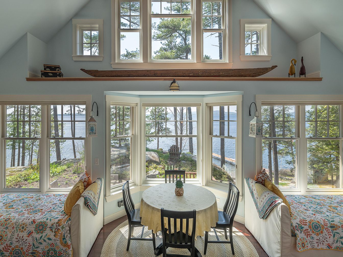 This charming breakfast nook, nestled in front of expansive, multi-paned windows, offers breathtaking views of a serene lakeside landscape. Soft blue-gray walls complement the creamy white window trim, enhancing the calming atmosphere. On either side of the central bay window, built-in cozy daybeds with colorful floral quilts and mustard accent pillows create inviting spots for relaxation. The round table, draped with a light yellow tablecloth, is surrounded by four black wooden chairs that add contrast while maintaining simplicity. A circular braided rug anchors the seating space, and tasteful nautical and nature-inspired décor, including a wooden boat and bird figurines on a ledge, elevate the room’s coastal cottage aesthetic.