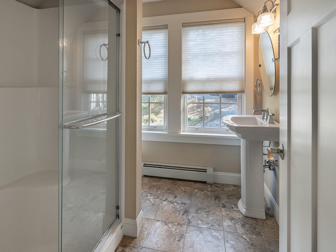 This bathroom features a clean, classic design with neutral beige walls complemented by large, textured stone tiles on the floor. A glass-enclosed shower on the left provides a sleek, modern touch, while a traditional white pedestal sink on the right adds timeless elegance. Two large, multi-pane windows with soft white shades allow ample natural light to flood the space, brightening the room while maintaining privacy. Chrome fixtures, including a towel ring and wall-mounted lighting above the sink’s oval mirror, enhance the overall polished and functional feel of the room.