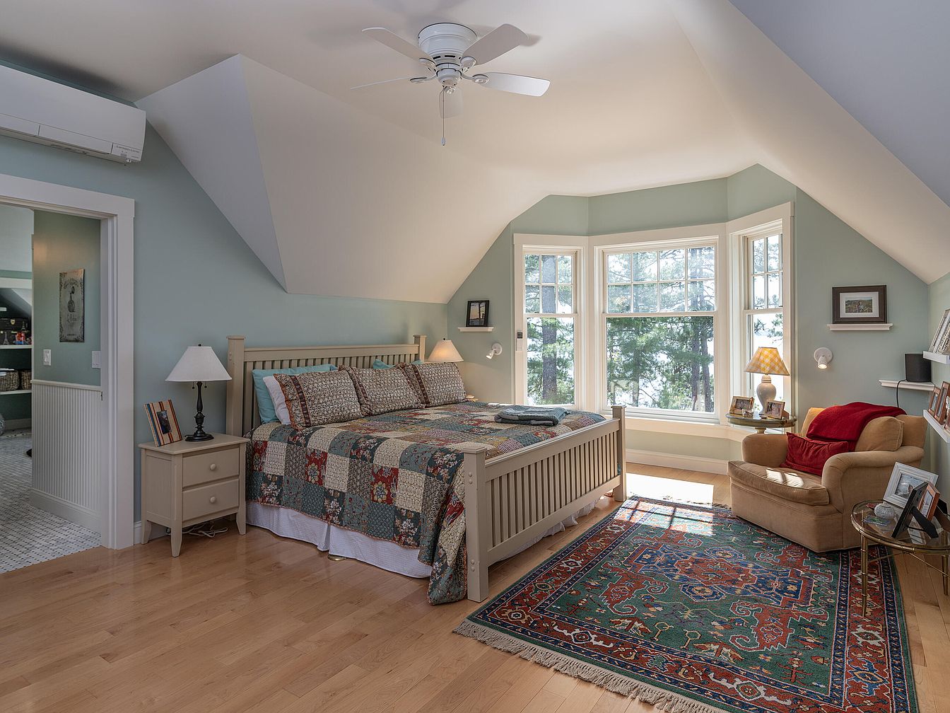 This bedroom features a charming, sloped ceiling design painted in crisp white contrasted by muted sage green walls, creating a serene atmosphere. The centerpiece is a beige wooden bed frame dressed with a colorful, patchwork quilt complementing the tones in the Persian-style rug beneath. Natural light floods through a trio of large, multi-pane windows set in a cozy bay, offering scenic views and highlighting an inviting reading nook with a plush beige armchair and red throw. Warm wood flooring anchors the space alongside simple, functional furnishings and subtle decorative touches.