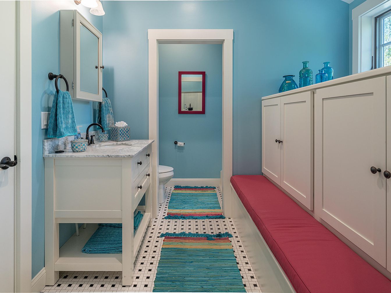 This bathroom features a refreshing color palette dominated by soft sky blue walls contrasted with clean white cabinetry and trim. The floor is detailed in classic black-and-white mosaic tile, lending a timeless feel. On the left, a white vanity with a marble countertop is paired with a black faucet and matching towel rings holding teal towels, enhancing the color harmony. Opposite the vanity, a built-in bench with a deep maroon cushion provides cozy seating beneath white paneled cabinets topped with decorative blue glass bottles. The toilet area is visible through a framed doorway, accented by a red-framed mirror that adds a pop of unexpected color. Two blue-green woven rugs extend along the floor, unifying the space and adding warmth and texture.