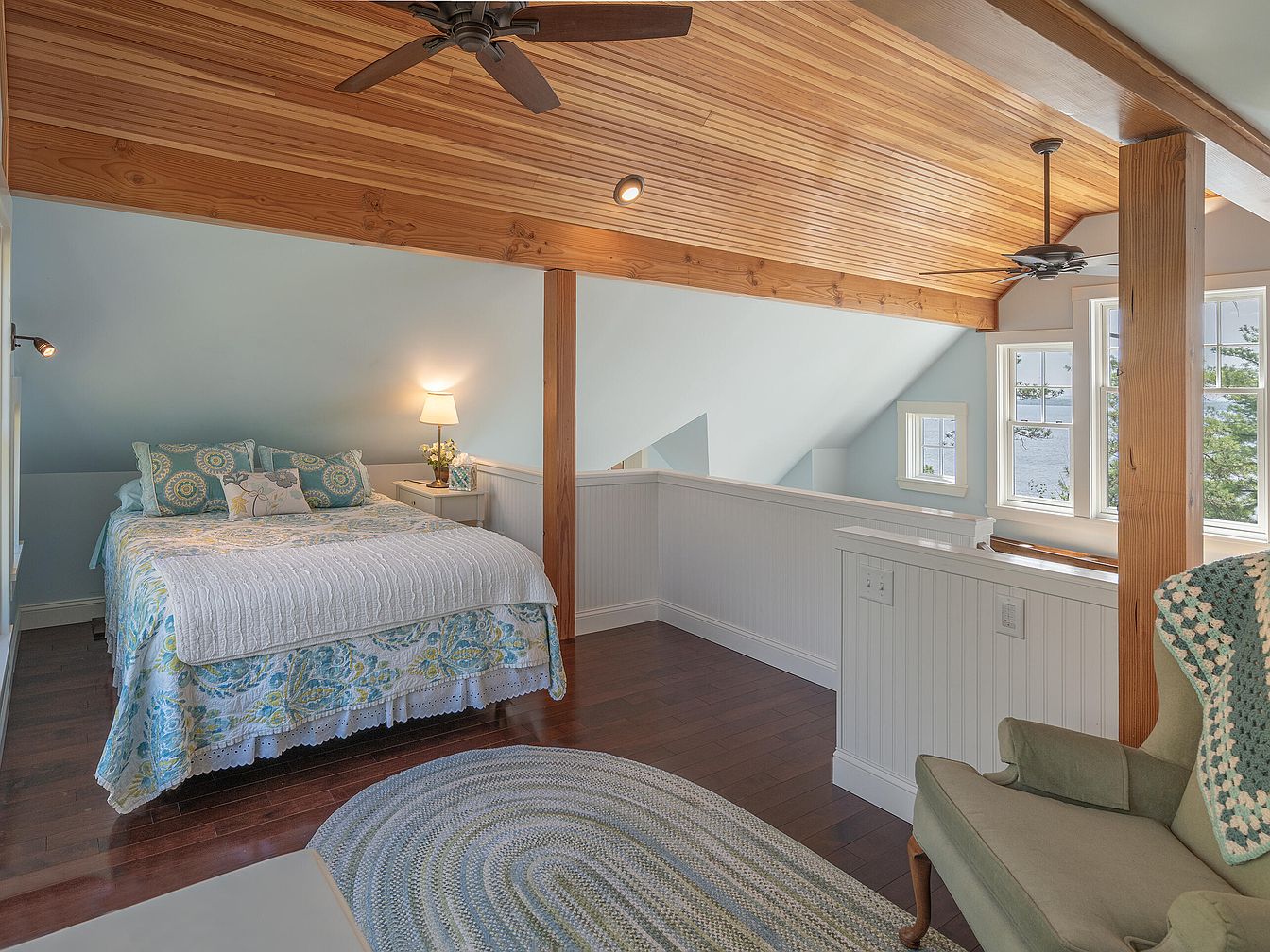 This cozy loft bedroom features a sloped ceiling with natural wood paneling that adds warmth and texture to the space. The walls are painted a soft pastel blue, complementing the wooden ceiling and the rich brown hardwood floors. A full-sized bed is dressed with a quilt and pillows in shades of blue, green, and white floral patterns, creating a refreshing, inviting atmosphere. A white nightstand with a small lamp provides ambient lighting. A plush braided oval rug in coordinating colors anchors the space. A comfortable green armchair with a crocheted throw sits nearby, next to wide windows offering scenic views and natural light. Ceiling fans enhance airflow in this serene retreat.