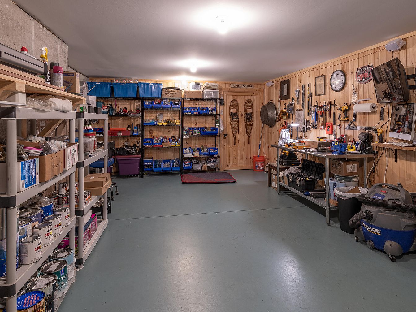 This spacious basement workshop features a practical and organized layout, ideal for DIY projects and storage. Light wood paneling covers the walls, lending a warm and rustic ambiance, balanced by a smooth, cool blue-gray painted concrete floor. On the left, shelves hold paint cans and various supplies, while the back wall is lined with black metal shelving units housing blue plastic bins filled with tools and small parts. The right side reveals a workbench with tools neatly arranged on pegboards above it, alongside a mounted television and a vacuum cleaner, blending functionality with a cozy, hobby-focused aesthetic.